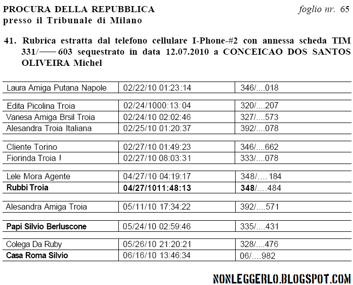 E' la rubrica telefonica di Michel Conceicao, la prostituta brasiliana che la notte del 27 maggio scorso fece quella famosa chiamata al Cavaliere, avvertendolo del fermo di Ruby.